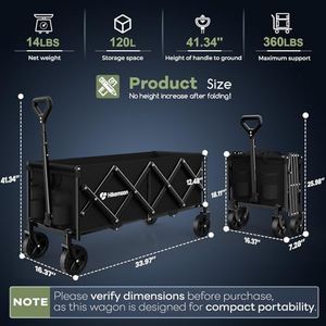 The Originsure 38" L Collapsible Wagon Cart is a versatile and heavy-duty folding wagon with a remarkable weight capacity of 460 pounds, making it suitable for carrying groceries, beach gear, camping equipment, and more. Its large size (37.40"L x 24.21"W x 24.00"H) offers substantial storage space of 220 liters, yet it folds down compactly to save space when not in use, making it convenient for storage in car trunks or small corners. The all-metal frame is sturdy and durable, paired with a thick, waterproof, and tear-resistant 600D Oxford fabric that ensures long-lasting use.