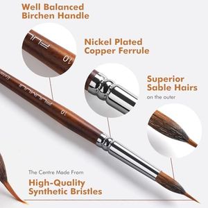 The Fuumuui Sable Watercolor Brushes Professional 8-piece set offers a variety of brush shapes, including pointed rounds, flats, and cat's tongue oval wash, making it versatile for different painting techniques and styles. This variety is beneficial for detailed work as well as covering larger areas. The high-quality kolinsky sable bristles provide excellent color carrying capacity and allow for smooth, consistent color flow, which is crucial for achieving fine details and fluid strokes in watercolor painting.